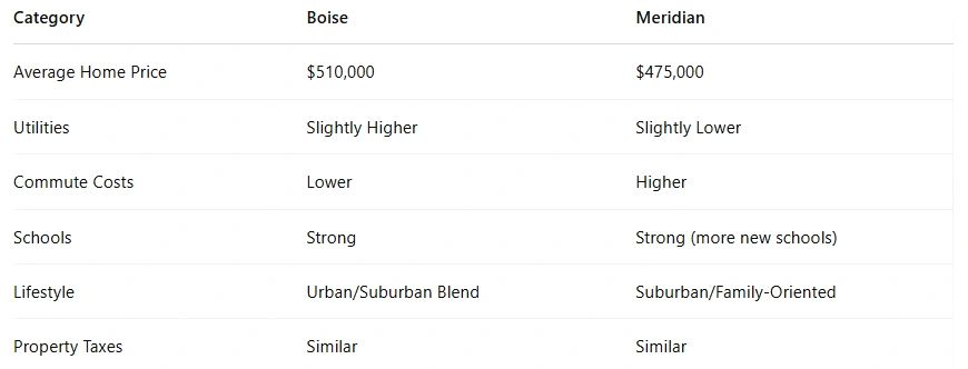 ➡️ Verdict: If you're looking for newer homes and a bit more affordability, Meridian may have the edge. But for walkable neighborhoods and charm, Boise is hard to beat.